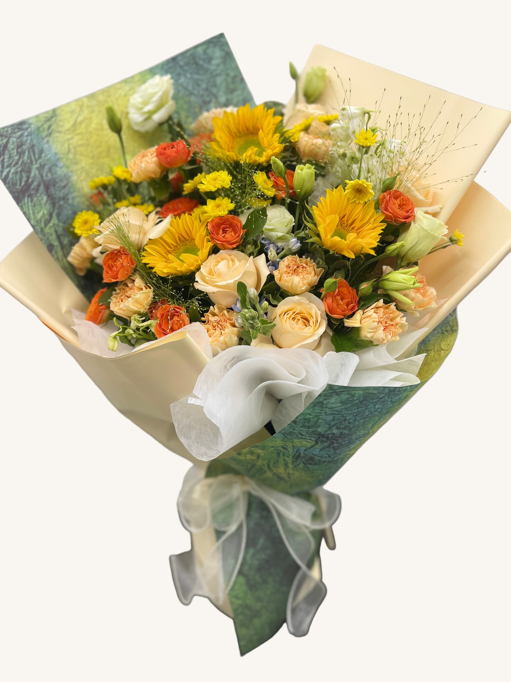 This vibrant Floral Symphony Mixed Bouquet artfully combines champagne roses, creamy yellow tulips, white eustoma, orange bubble roses, sunflowers, and yellow daisies, creating a harmonious blend of warmth and vitality. Each flower exudes its own unique charm, symbolizing love, friendship, and joy—making this bouquet the perfect choice for expressing heartfelt sentiments.With its rich color palette and elegant packaging, this bouquet is ideal for gifting to loved ones or adding a splash of beauty to your own space. Whether celebrating special moments or simply brightening up everyday life, this mixed bouquet brings an abundance of warmth and delight to any occasion.