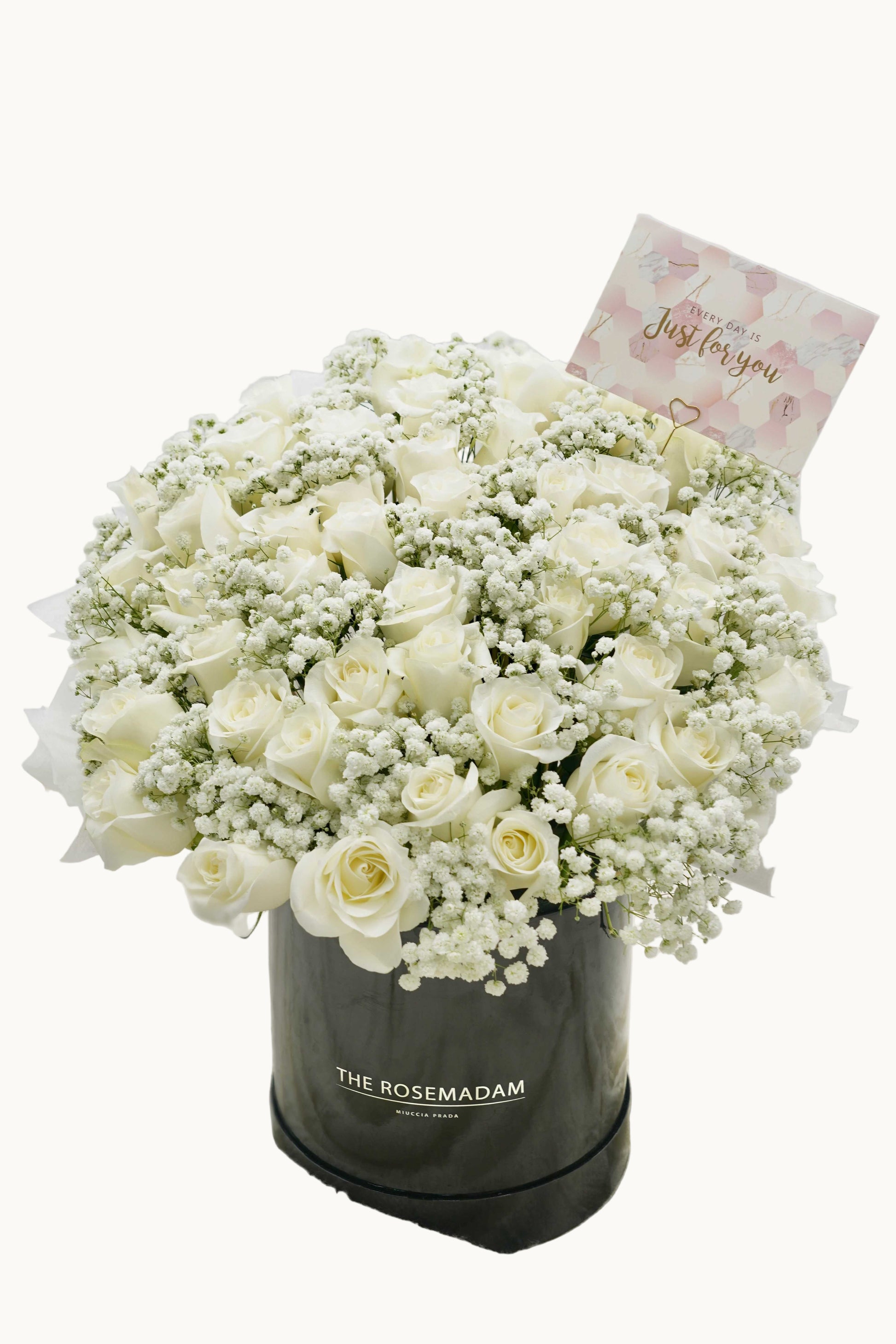 This "You Shine Like A Star" Hug Bucket Bouquet features pristine white roses and baby’s breath, showcasing a simple yet elegant beauty. Each white rose symbolizes purity and genuine love, while the baby’s breath adds a dreamy softness to the bouquet, as if capturing the fresh air and warm sunlight, shimmering like twinkling stars. The overall spherical design gives this bouquet a fuller appearance, presenting a unique artistic flair and visual impact.Perfect for various occasions, whether as a birthday gift, wedding decoration, or a heartfelt expression of blessings and love, this "You Shine Like A Star" Hug Bucket Bouquet conveys deep emotions and beautiful wishes. Choose this bouquet to fill each moment with warmth and romance, allowing love to blossom in everyday life.